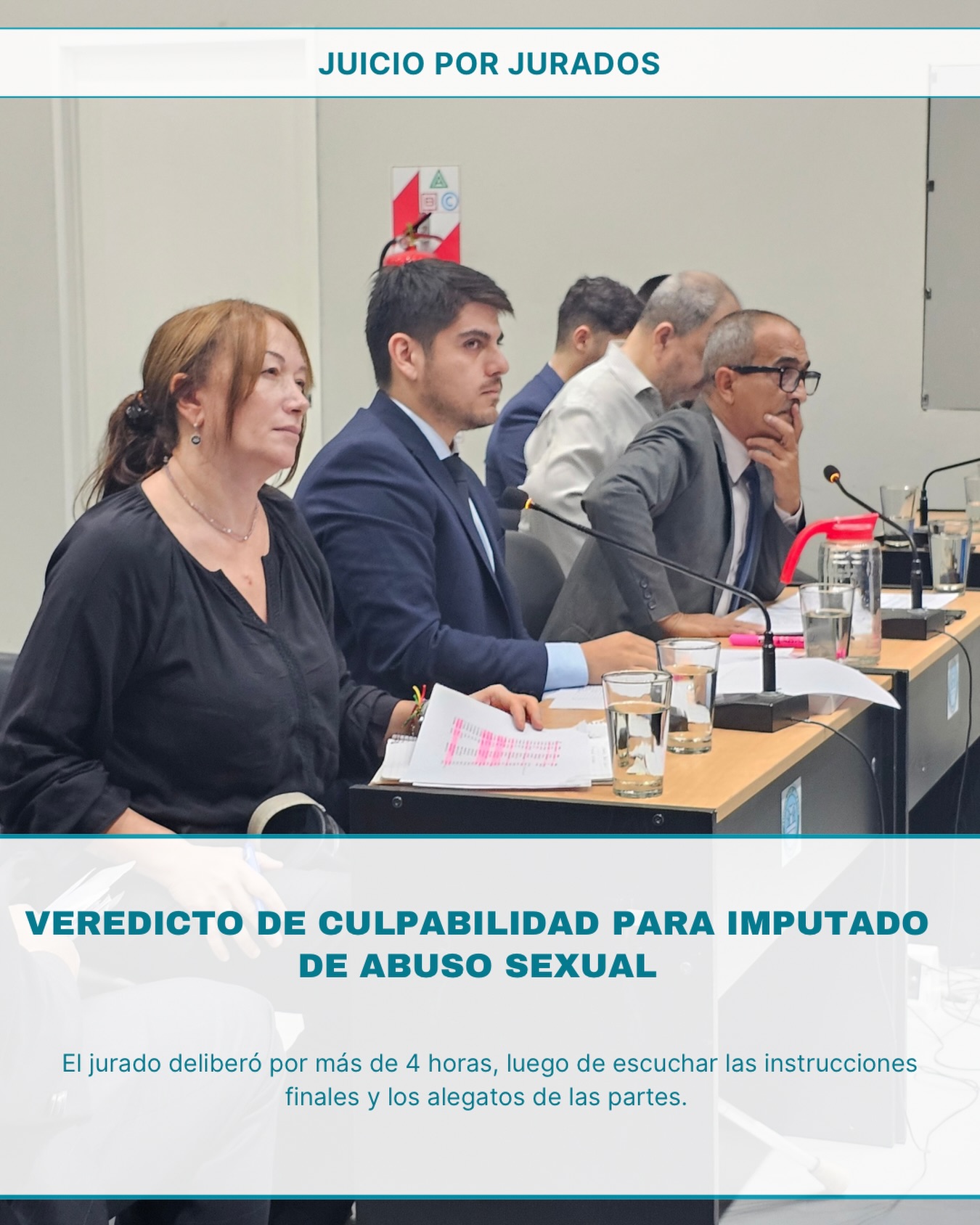 Luego de una jornada que comenzó por la mañana con las instrucciones finales del juez y los alegatos de cierre de las partes, el jurado deliberó durante 4hs y llegó al veredicto de CULPABILIDAD por el delito de abuso sexual con acceso carnal continuado.En esta oportunidad el juez director, fue