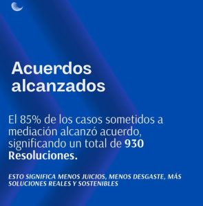Uno de los datos más relevantes del año es el nivel de acuerdos alcanzados: el 85 % de los casos sometidos a mediación concluyó con acuerdo, lo que representa un total de 930 acuerdos celebrados. Este resultado confirma la eficacia de la mediación judicial para resolver conflictos, reducir la litigiosidad y generar soluciones reales y duraderas, evitando el desgaste que implica un proceso judicial tradicional.